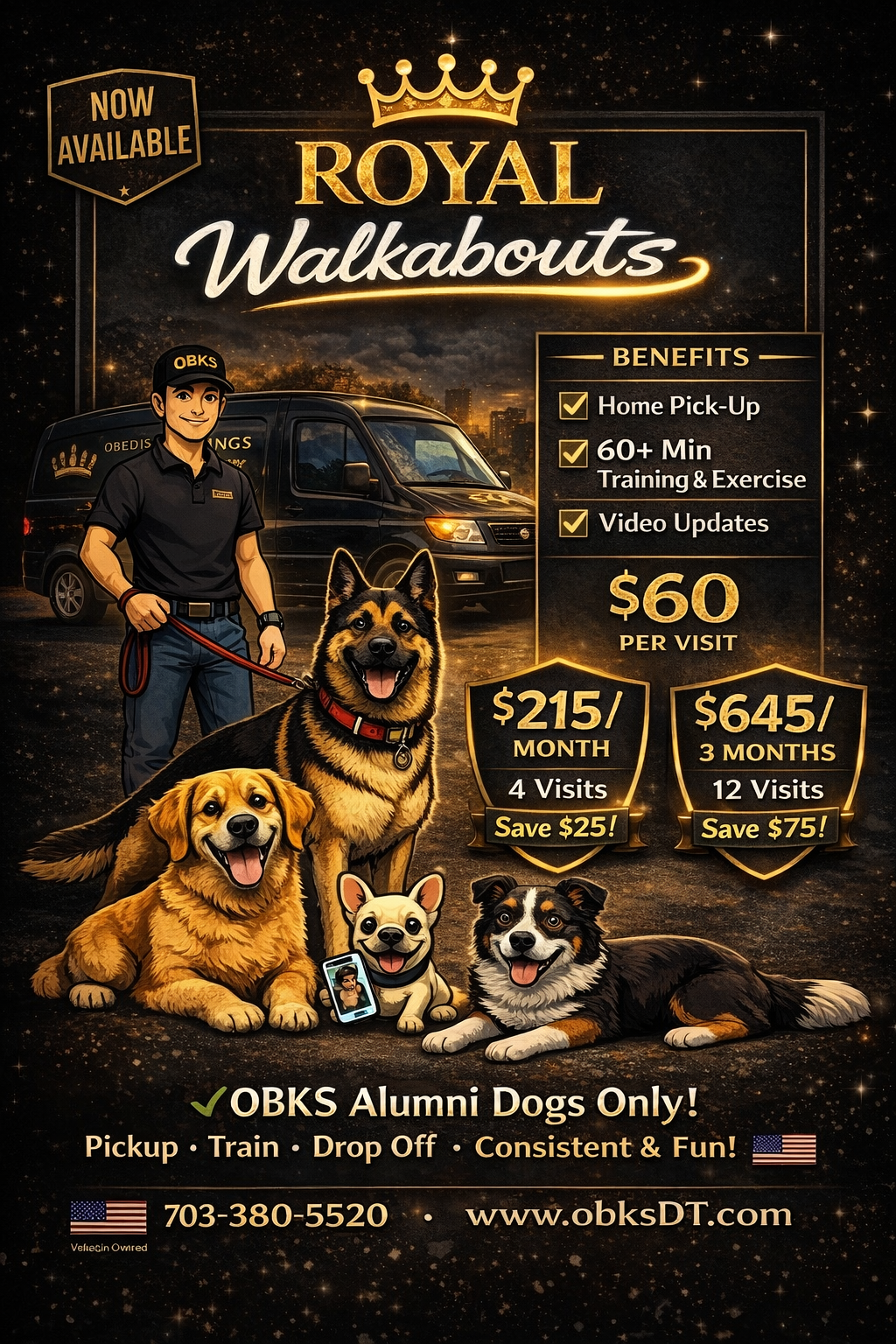 Royal Walkabouts™ is an exclusive mobile enrichment service for Obedience Kings Alumni dogs. Designed to maintain structure, obedience, and mental fulfillment—without adding stress to your schedule.