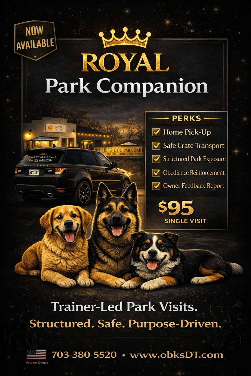 Royal Park Companion is a premium service by Obedience Kings designed for new clients and alumni. We pick up your dog, transport them safely, and guide them through a professionally supervised visit to Barking Barley, focusing on calm behavior, social skills, and obedience in a real environment.