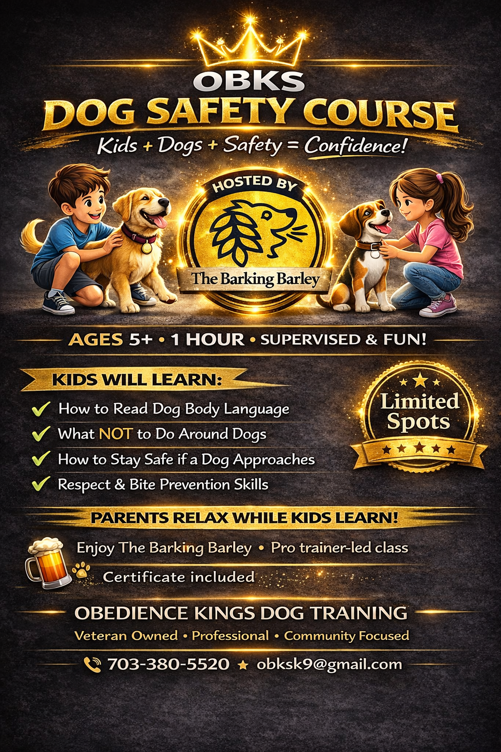 Join us on March 28th from 12:30pm-1:30pm for a fun and educational experience that helps kids build confidence around dogs! Hosted by The Barking Barley and led by our professional trainers, this one-hour course is designed for kids ages 5+.